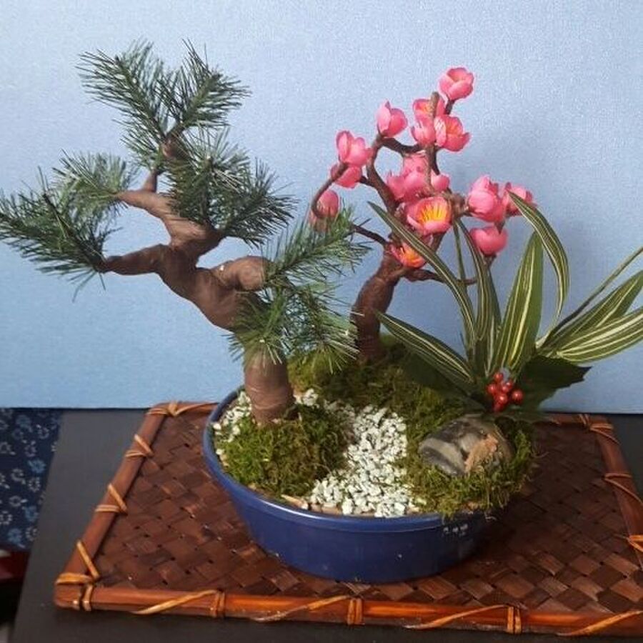 正月用の松の寄せ植えミニ盆栽を100均の松と梅の造花を使って作りました 暮らしニスタ